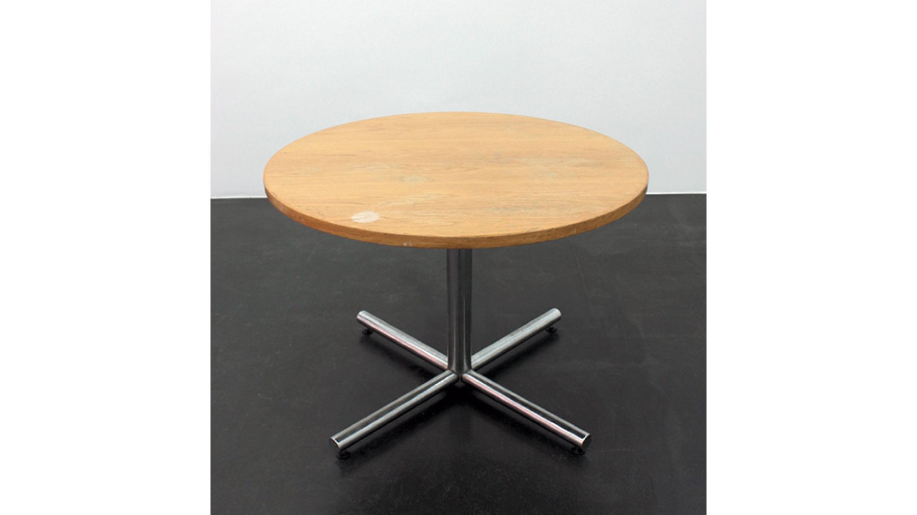 Cameron Rowland, 49-51 Chambers Street - Basement, New York, NY 10007, 2014. Wooden table top, base, hardware. 31 x 42 x 42 in.