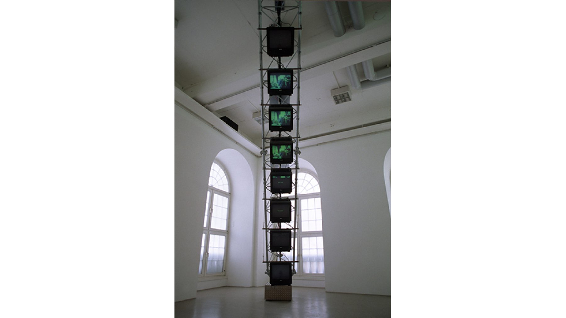 Dara Birnbaum, Transmission Tower: Sentinel, 1992. Eight-channel color video, 2:48 min; 2 sections of ROHM® transmission tower, 9 stereo channels of audio with custom hardware. Installation view Documenta 9, Kassel, Germany, 1992. Courtesy of the artist and Marian Goodman Gallery.
