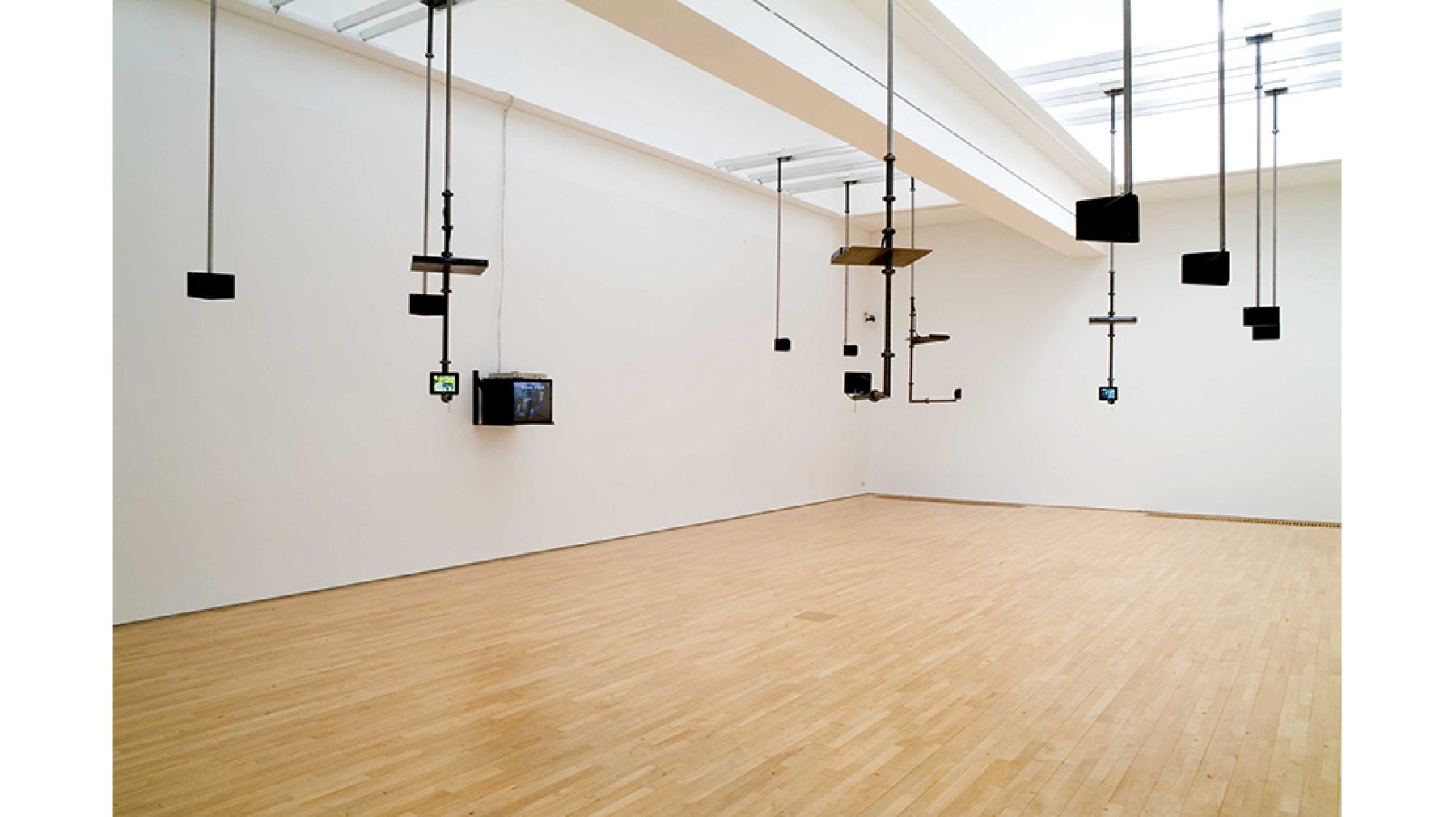 Dara Birnbaum, Tiananmen Square: Break-In Transmission, 1990. Five-channel color video, four channel stereo sound, surveillance switcher and custom-designed support system. Installation view S.M.A.K, Ghent. Courtesy of the artist and Marian Goodman Gallery.