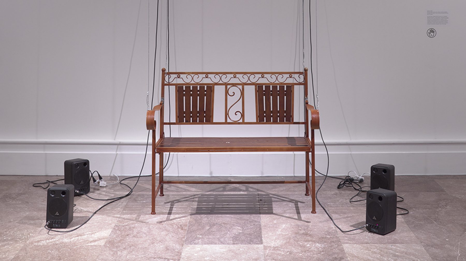 Tony Conrad, Quartet, 2008. Wooden bench, mucis wire, pickups, and four speakers. Bench: 34 1/4 x 42 1/2 x 23 1/4 in. (87 x 108 x 59 cm); overall dimensions variable. Courtesy The Estate of Tony Conrad and Galerie Buchholz, Berlin/Cologne