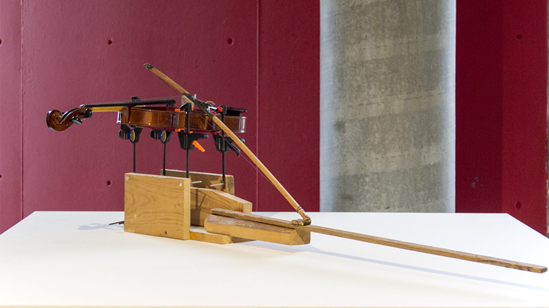 Bowstring, 2005. Violin, violin string, wood, and clamps. 48 x 22 x 16 1/4 inches. Courtesy The Estate of Tony Conrad and Galerie Buchholz, Berlin/Cologne/New York