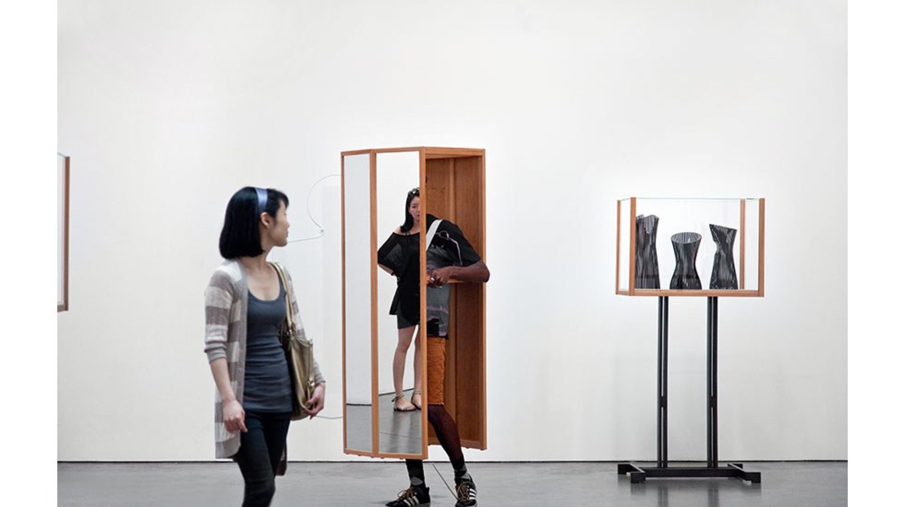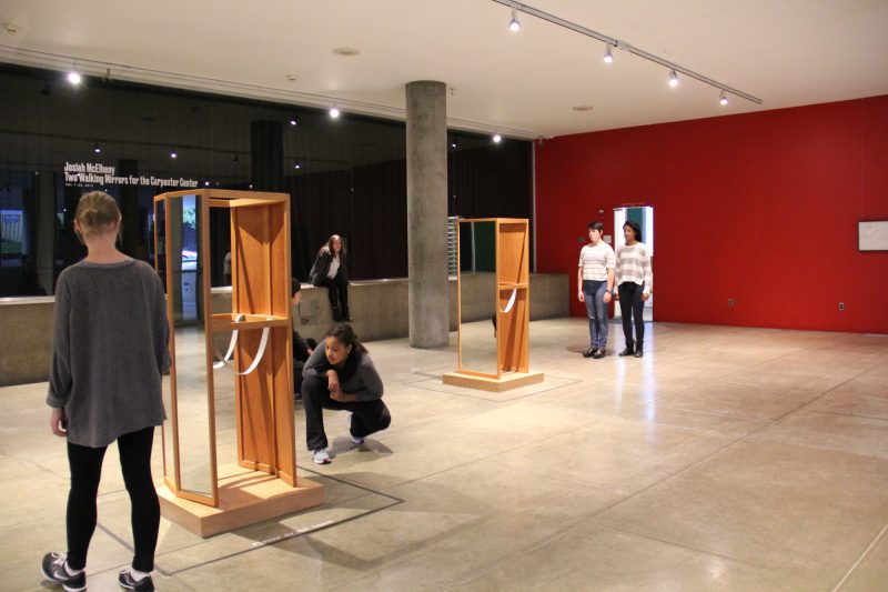Josiah McElheny: Two Walking Mirrors for the Carpenter Center, sculptures will periodically become part of performances when performers—in fact, Harvard University dance students—inhabit the sculptures on a published schedule, transforming the objects into a kind of fashion accessory. The performances are between 15 and 30 minutes in duration and occur at the following dates and times.