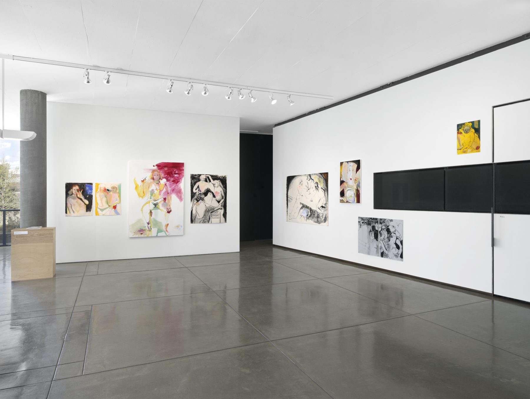 Installation view of work by Anna Correll, from left to right: I Know You Are But What Am I, book, 2023; Raspberry Show, oil pastel on paper, 2023; Stop Filming Me, oil pastel on paper, 2023; I Can Paint Myself!, oil paint and oil pastel on canvas, 2023; The Tent Builders, charcoal on paper, 2023; Drawing Together, charcoal and oil pastel on paper, 2023; Try Her On, oil paint and oil pastel on canvas, 2023; Club Drama, charcoal on paper, 2023; No Bra News, oil and oil pastel on paper, 2023. Courtesy of Carpenter Center for the Visual Arts. Photo: Julia Featheringill.