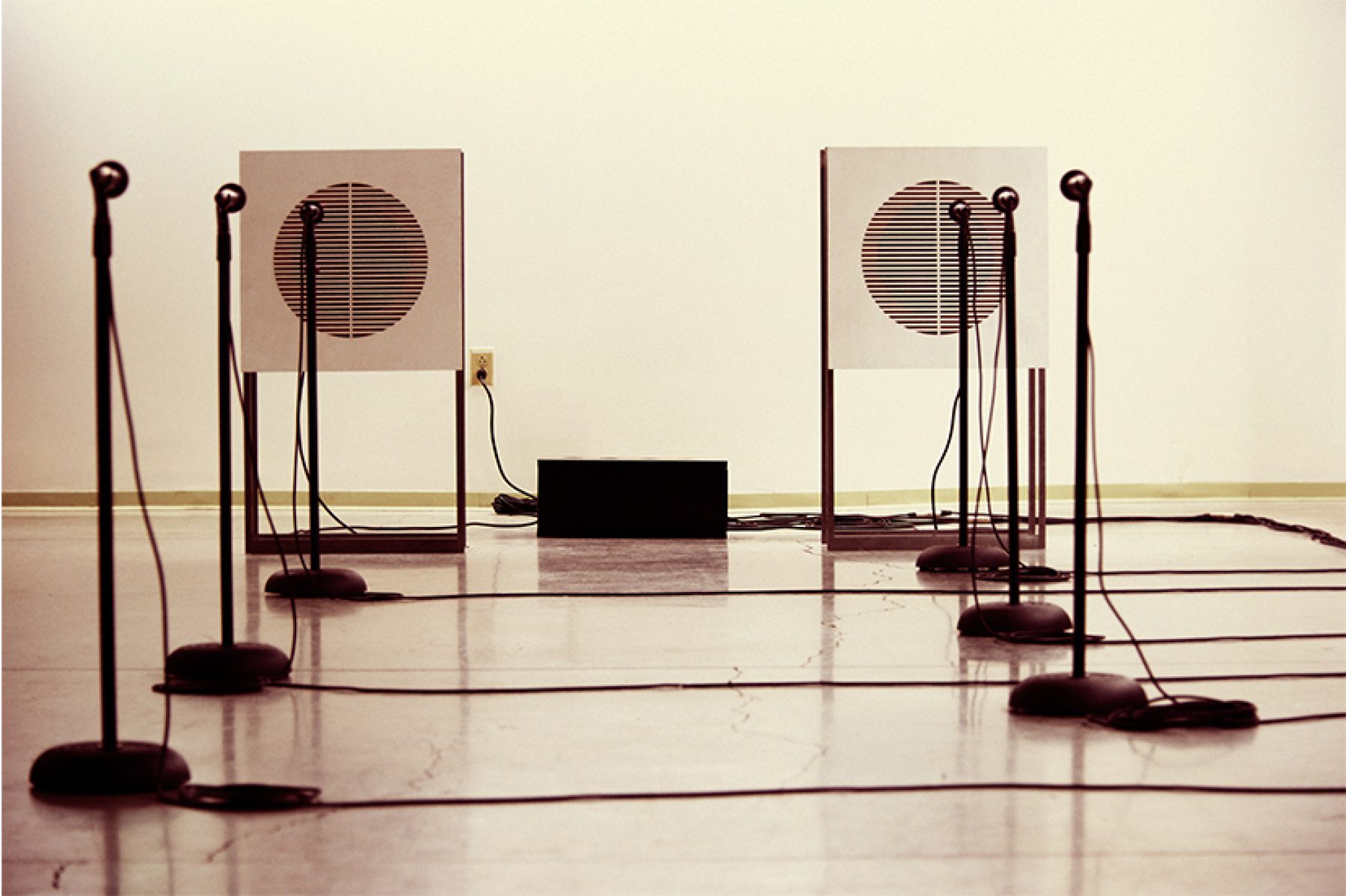 Six Microphones is a piece composed entirely of audio feedback that explores the mutually-constitutive relationship between sound, space, and the body. Departing from the simplest and most legible diagram of audio feedback—a microphone pointed at a loudspeaker—Six Microphones transforms the gallery from a space in which sound simply propagates, to the medium required to bring sound into being; it becomes the interior of a complex oscillator whose sonic textures are dependent on the gallery's geometry and materiality. Additionally, the location of listeners in the space subtly alters this interior; thus, being present to listen shapes the timbres to be heard.