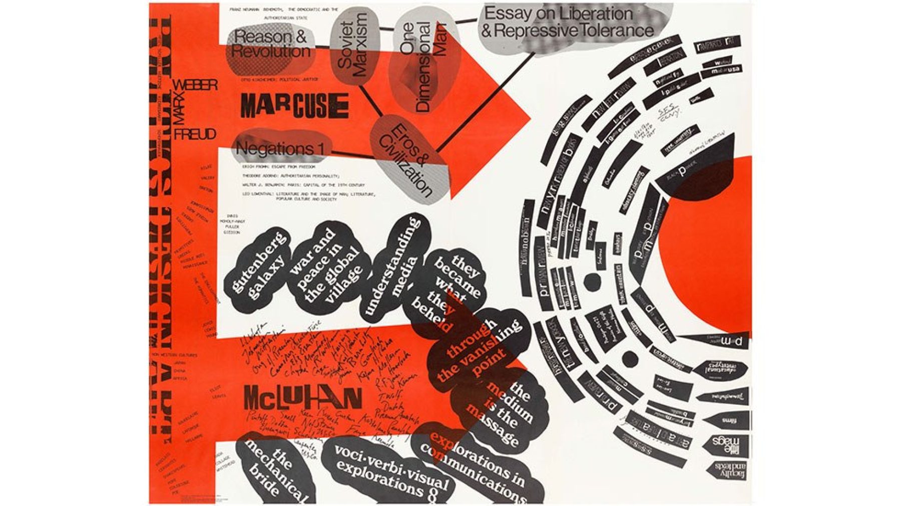 The book Blueprint for Counter Education by Maurice Stein and Larry Miller appeared in 1970 as a boxed set with three large graphic posters and a bibliography and checklist that map patterns and relationships between radical thought and artistic practices⎯from the modernist avant-gardes to postmodernism⎯with the philosopher Herbert Marcuse and media theorist Marshall McLuhan serving as intellectual points of anchorage. The book could be assembled into a portable, do-it-yourself learning environment with the posters and an accompanying “shooting script” functioning as a basis for a critically informed, activist and learner-driven model of education. Blueprint for Counter Education became one of the most defining works of radical pedagogy of the Vietnam War era and eventually integrated into the Critical Studies curriculum at California Institute of the Arts.