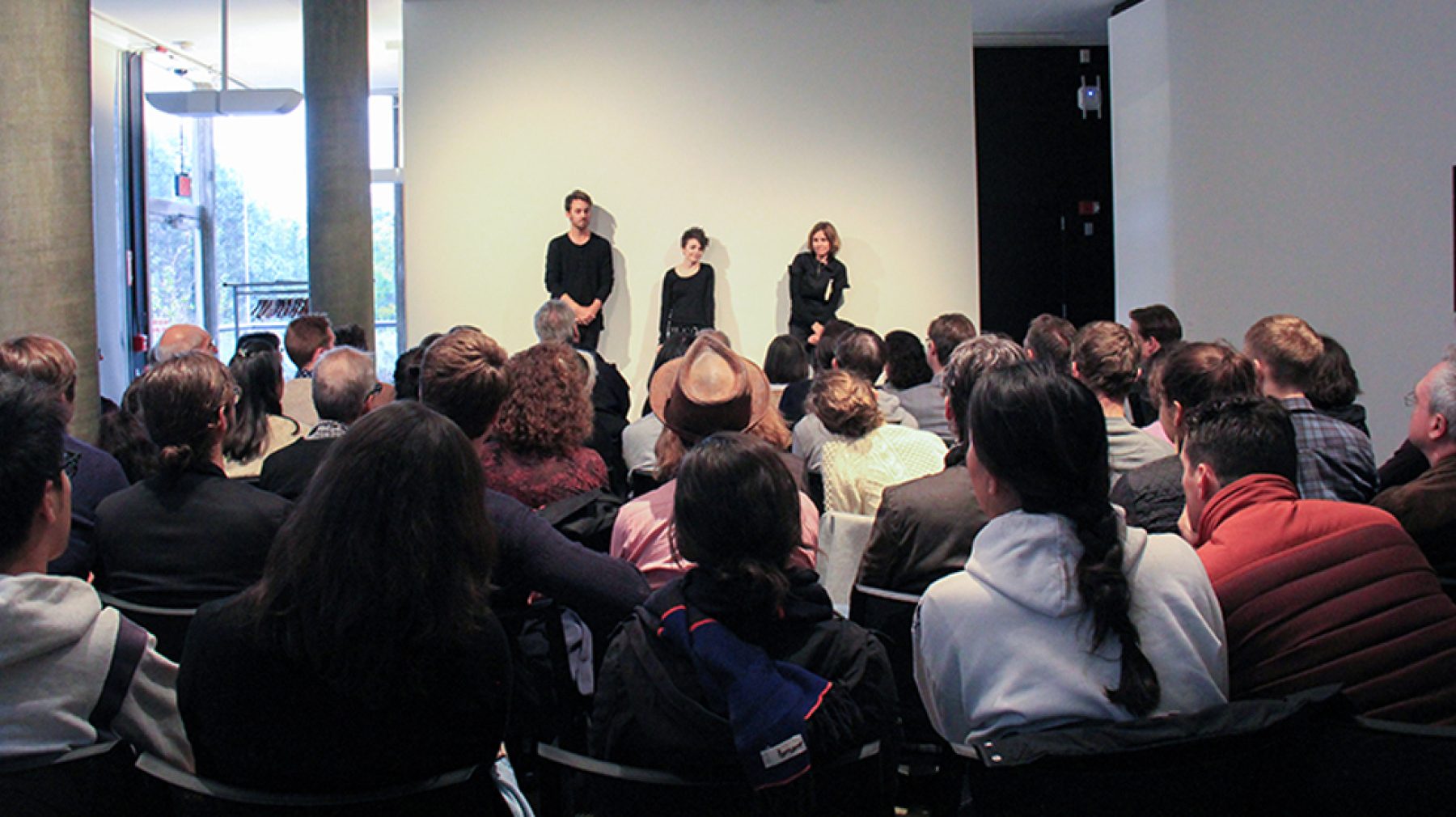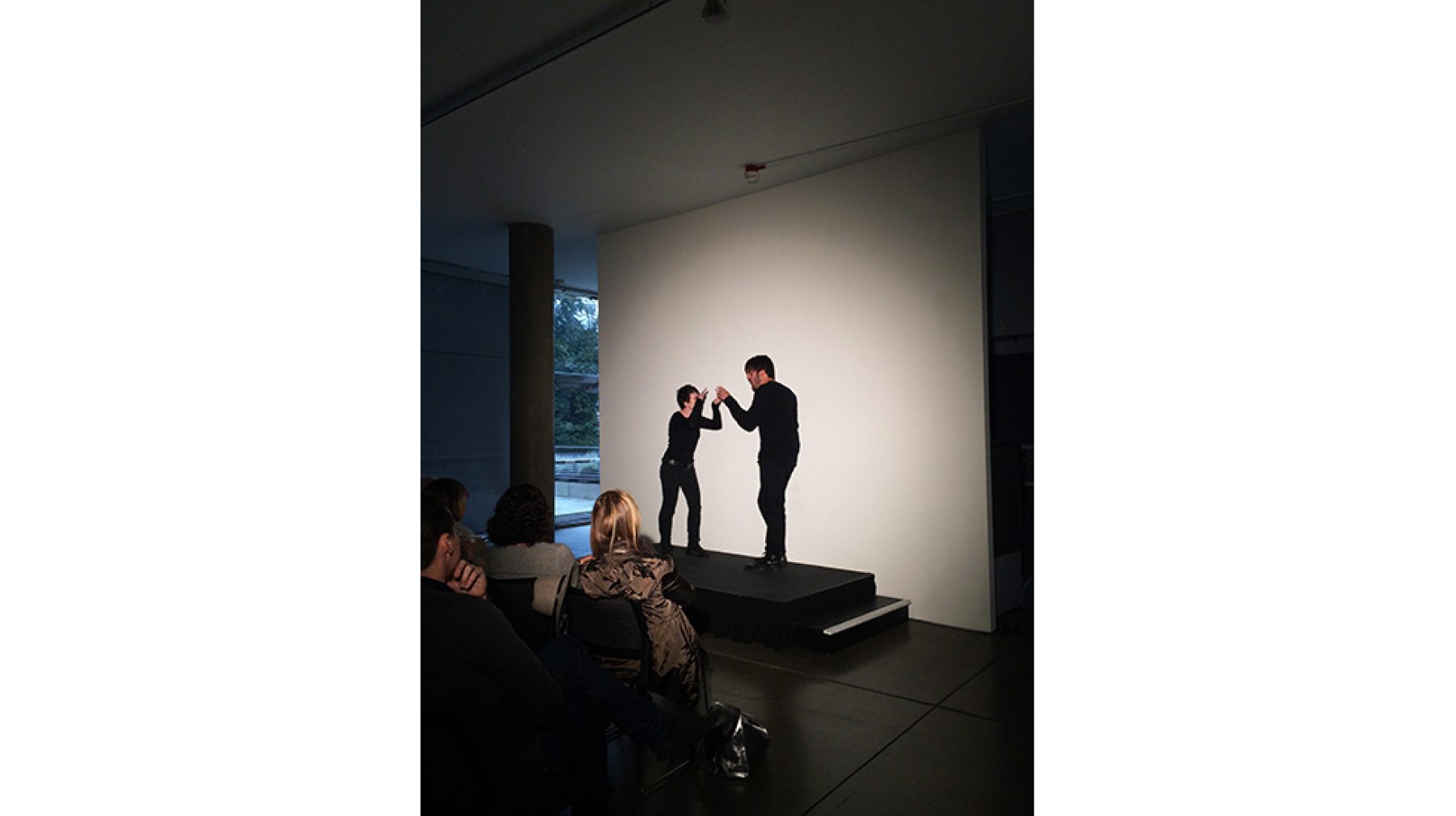 Kerry Tribe, Critical Mass (performance still), with Emelie O’Hara and Nicholas Huff, Carpenter Center for the Visual Arts, Level 3, Sert gallery, Oct 3, 2015.